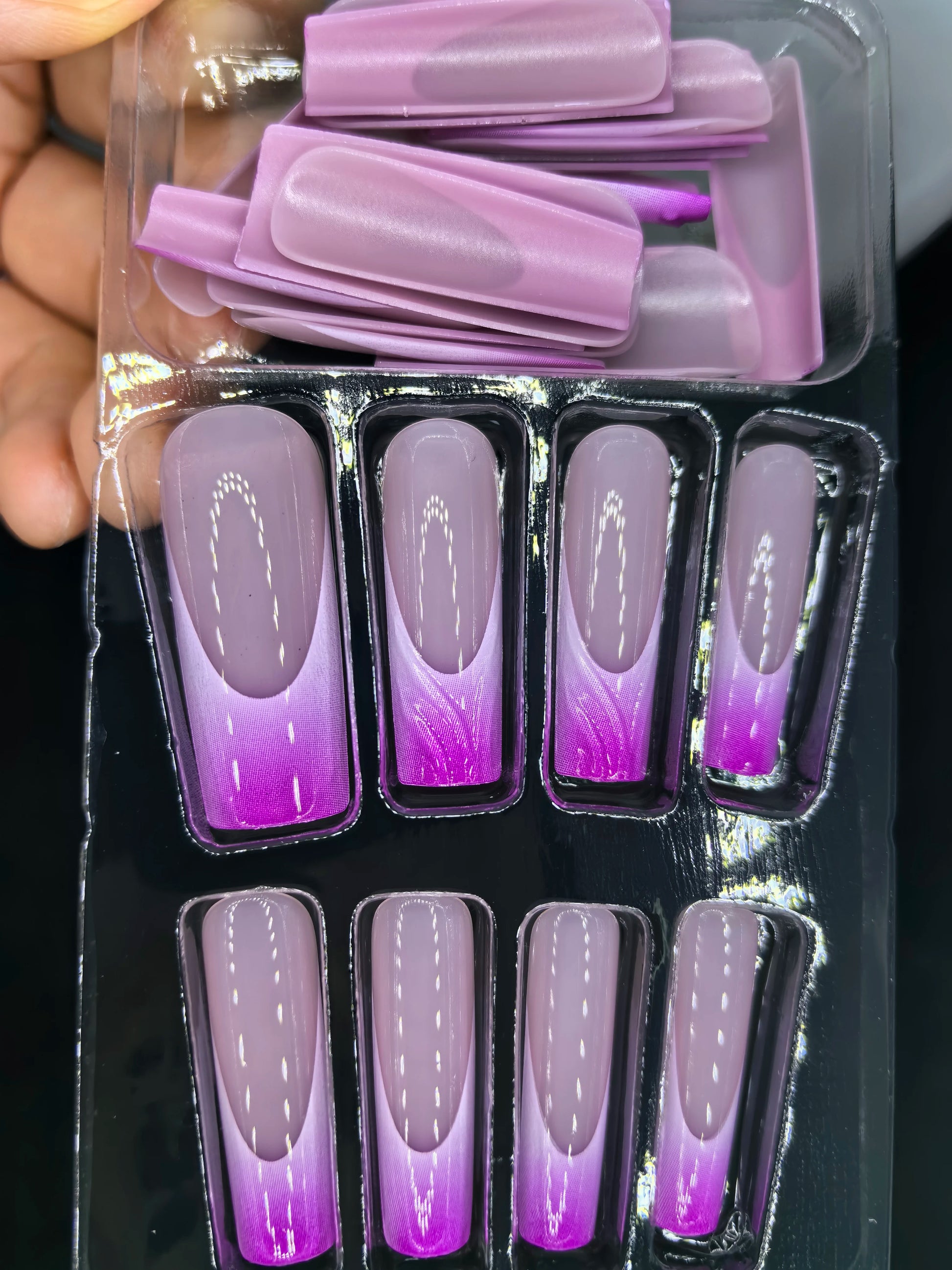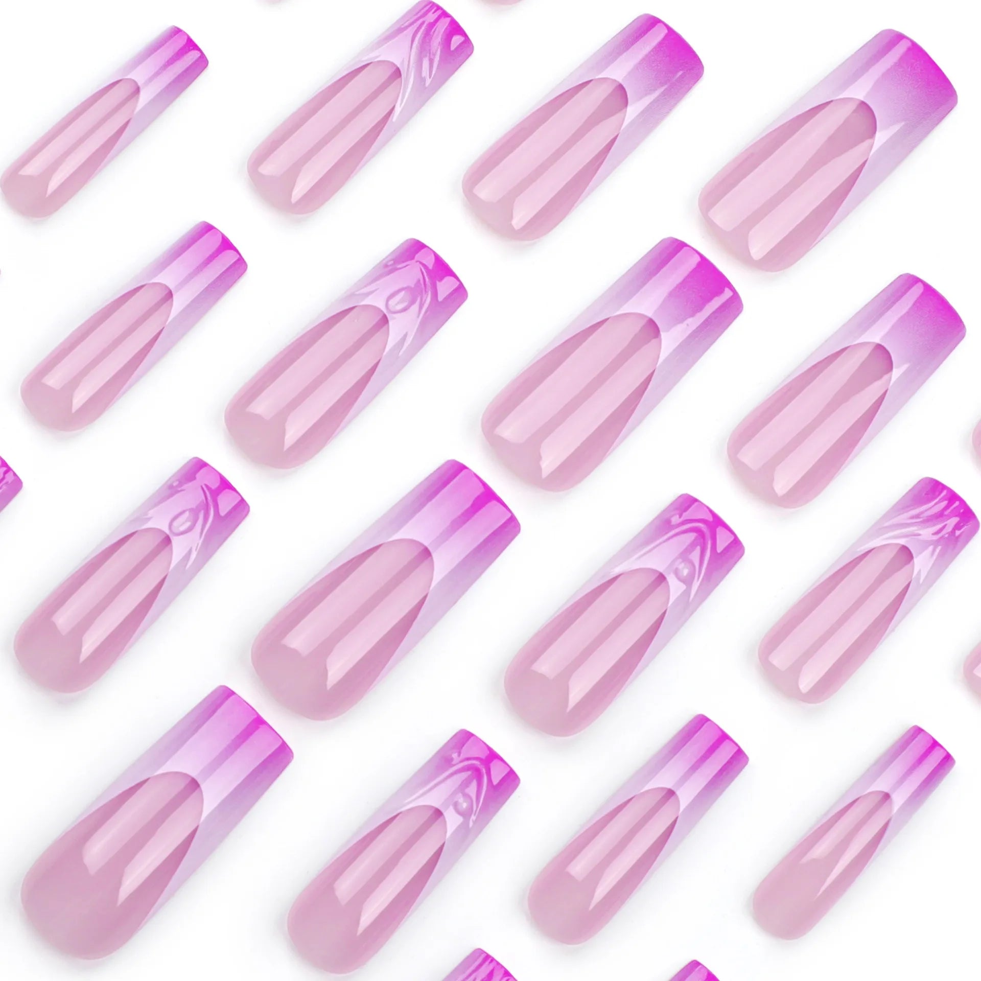 These press-on nails feature a beautiful blend of pink and purple tones with delicate artistic details. The French-inspired design adds elegance while the candy-like colors bring a playful, romantic touch that's perfect for special occasions or adding charm to your everyday style.