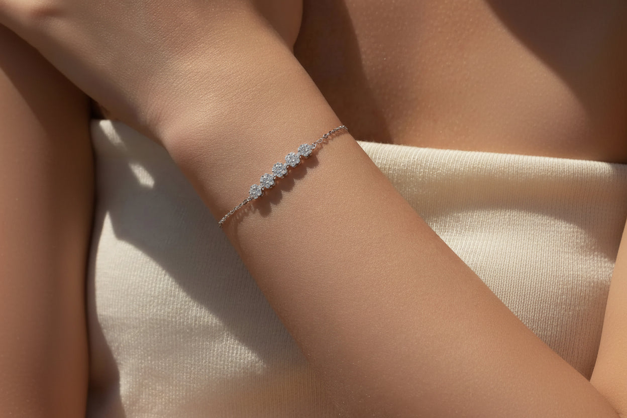 This exquisite four-piece jewelry set features stunning S925 sterling silver adorned with sparkling diamond accents in an elegant flower design. The complete set includes a necklace, earrings, ring, and bracelet for a coordinated, luxurious look.