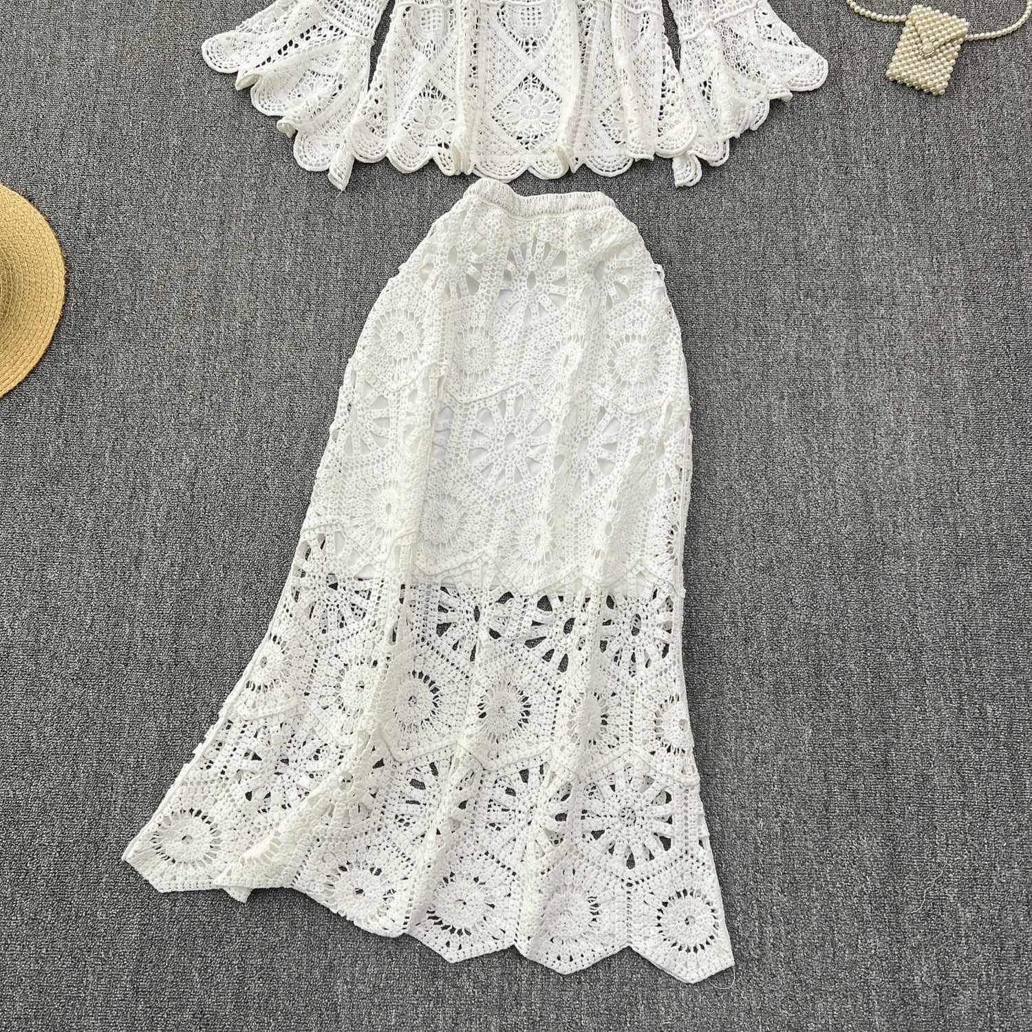 Wear the set together for a coordinated boho look, pair the loose knit top with denim shorts for casual vibes, or style the fishtail skirt with a fitted tank top for endless outfit possibilities. Add sandals and natural accessories to complete the bohemian aesthetic.